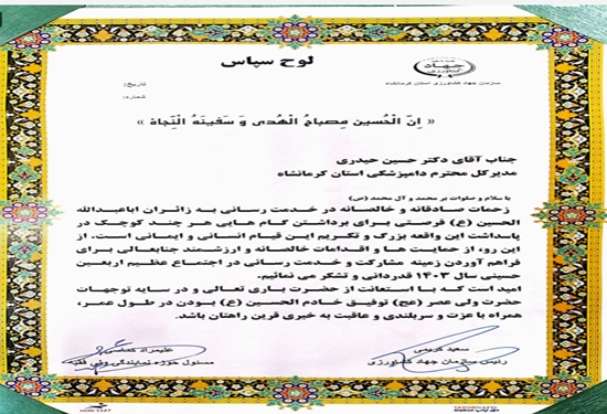 تقدیر رییس سازمان جهاد کشاورزی استان کرمانشاه و مسئول حوزه نمایندگی ولی فقیه سازمان جهاد کشاورزی از مدیرکل دامپزشکی استان در راستای خدمت رسانی به زائرین اربعین در سال ۱۴۰۳